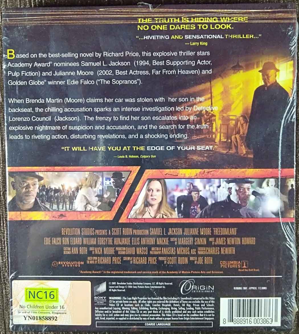 | Freedomland is a 2006 American crime drama mystery film directed by Joe Roth and starring Samuel L. Jackson, Julianne Moore, Edie Falco, Ron Eldard, William Forsythe, Aunjanue Ellis, and Anthony Mackie. It is based on Richard Price's 1998 novel of the same name, which touches on themes of covert racism. | ||