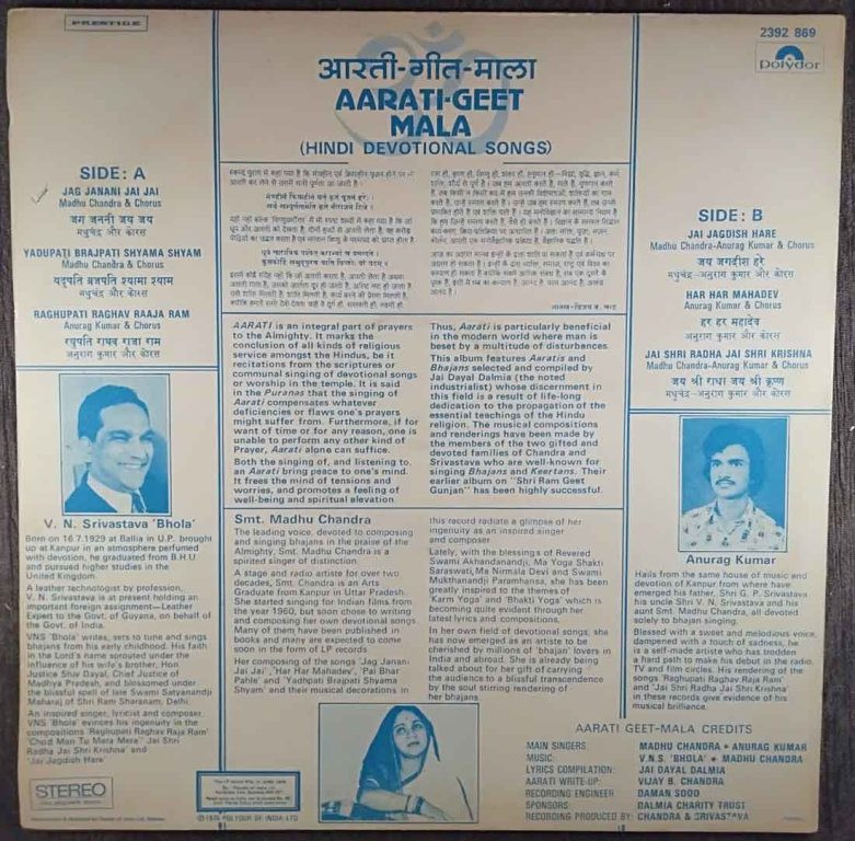 | Title | : | V. N. Srivastana 'Bhola', Madhu Chandra & Anurag Kumar – Aarati Geet-Mala (Hindi Devotional Songs) |
