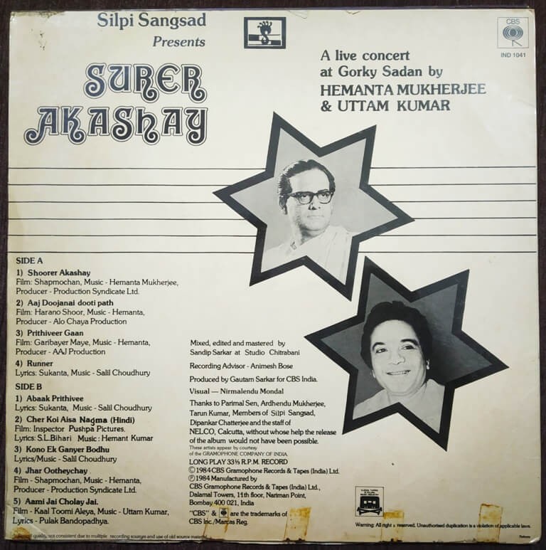 | Title | : | Hemanta Mukherjee & Uttam Kumar - Surer Akashay - A Live Concert At Gorky Sadan |