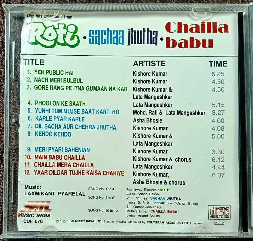 | 7. Dil Sacha Aur Chehra Jhutha | : | Kishore Kumar |