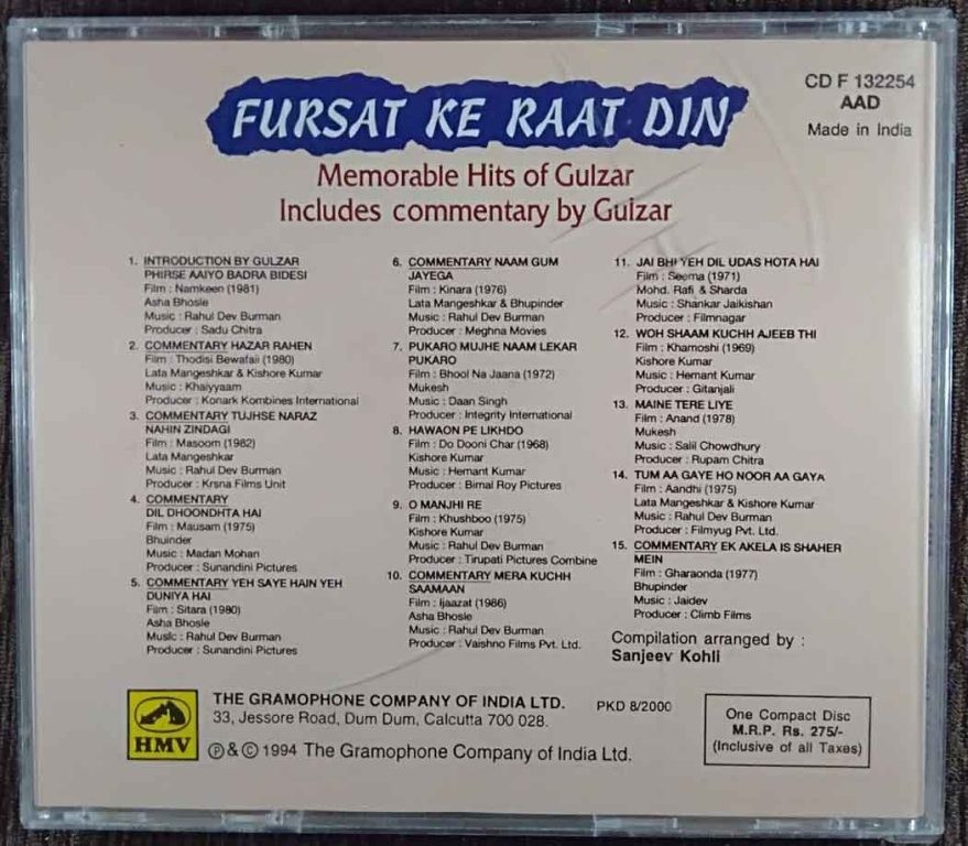 | Title | : | Gulzar – Fursat Ke Raat Din (Memorable Hits of Gulzar) - Includes Commentary Of Gulzar |
