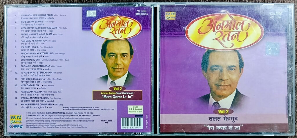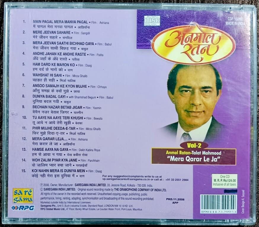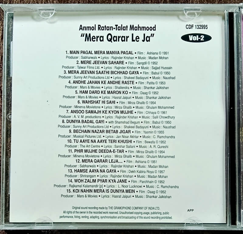 | Title | : | Talat Mahmood - Anmol Ratan Vol. 2 - Mera Qarar Le Ja |