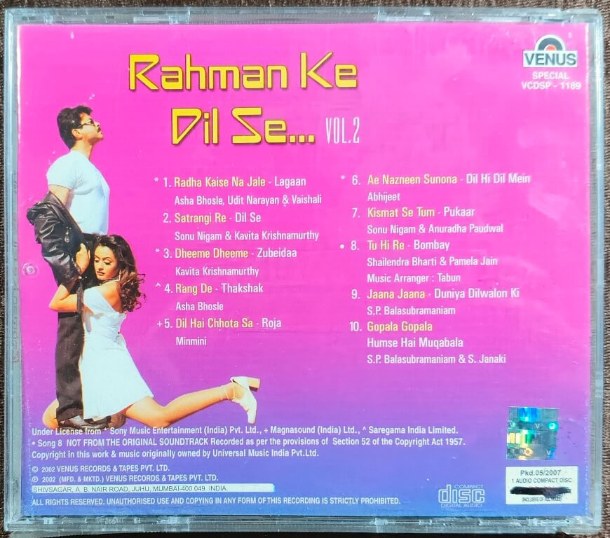 | Packaging | : | Pre-owned original Venus Audio CD housed in a standard jewel case, accompanied by printed inlay. A great addition for collectors and fans of A.R. Rahman’s timeless Bollywood music legacy. |