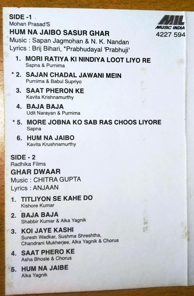 | Title | : | Hum Na Jaibo Sasur Ghar / Ghar Dwaar |