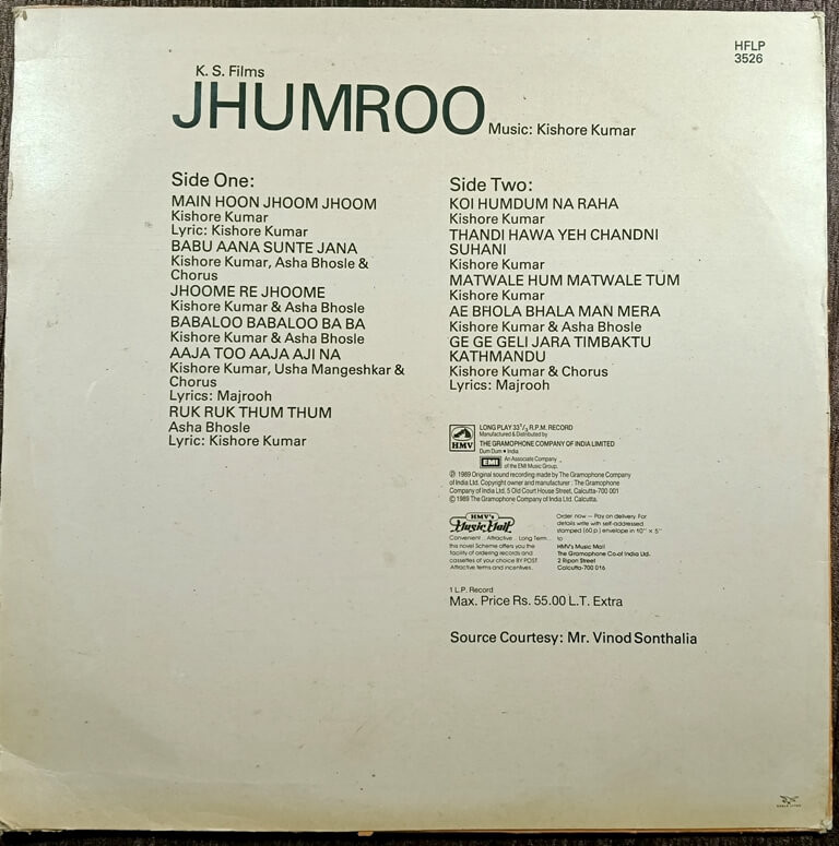 Jhumroo (1989) Kishore Kumar Pre-Owned Vinyl, 12" HMV LP Record