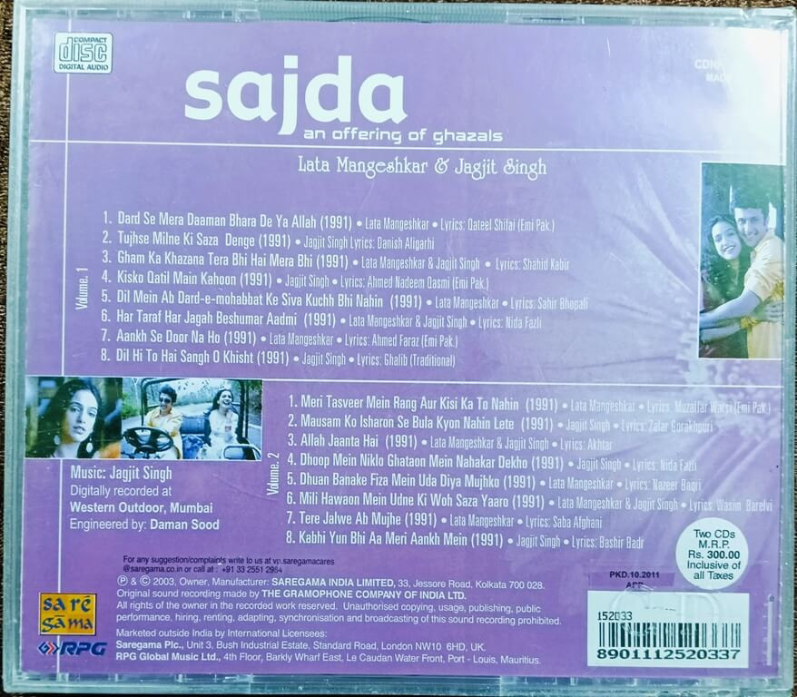 | Title | : | Lata Mangeshkar & Jagjit Singh - Sajda (An Offering Of Ghazals) |