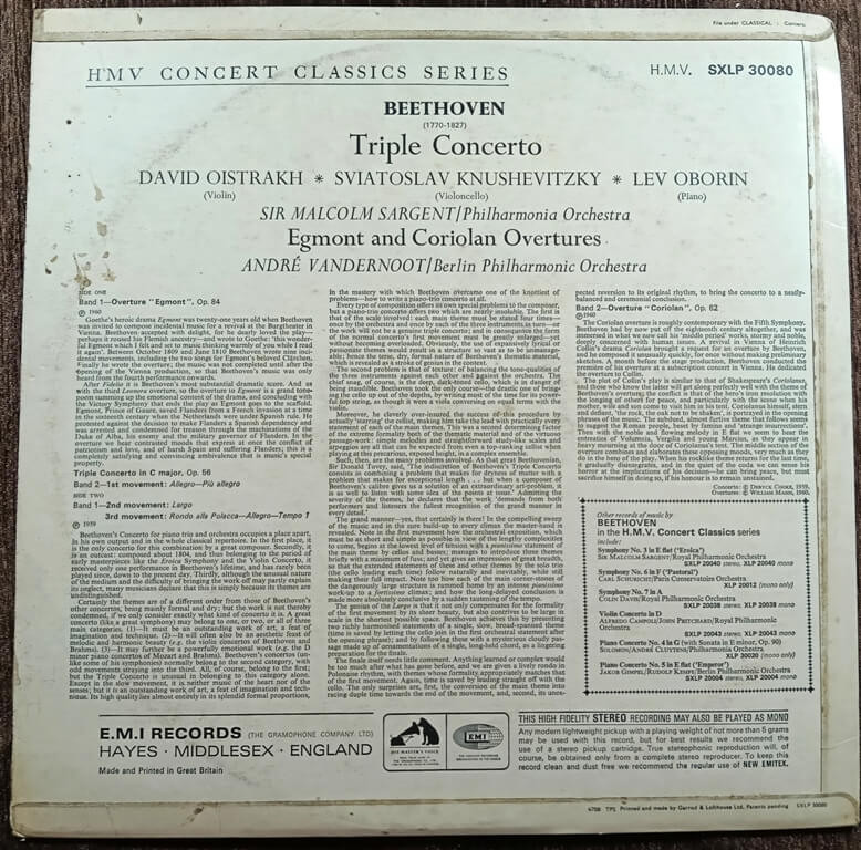 | Title | : | Beethoven, David Oistrakh Sviatoslav Knushevitsky Lev Oborin, Philharmonia Orchestra / Sir Malcolm Sargent, Berlin Philharmonic Orchestra / André Vandernoot – Triple Concerto / Egmont And Coriolan Overtures |