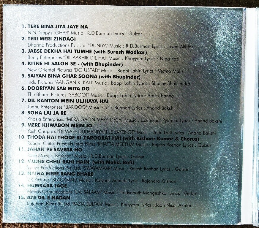 | 1. Jab Andhera Hota Hai (Raja Rani) | : | Asha Bhosle |