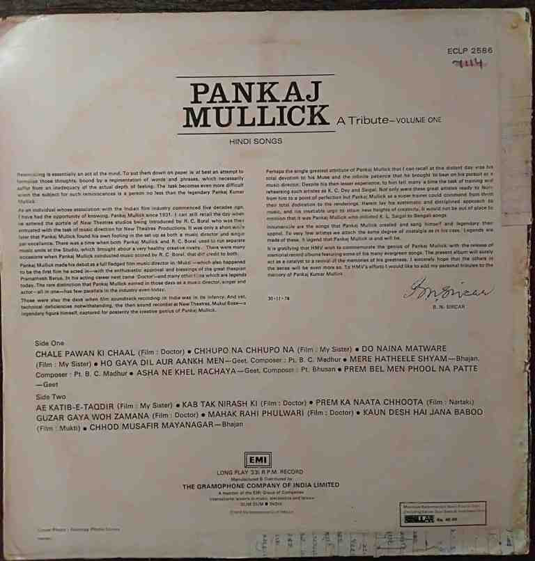 | Title | : | Pankaj Mullick - A Tribute Vol. 1 Hindi Songs |