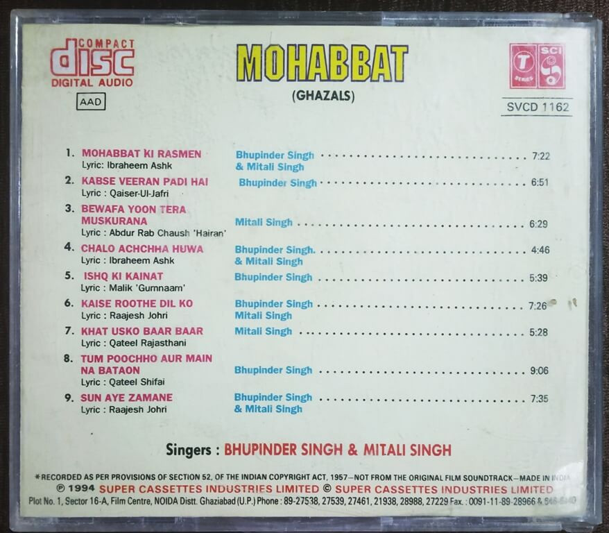 | Title | : | Bhupinder Singh & Mitali Singh - Mohabbat |