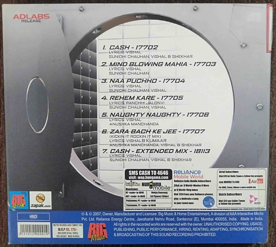 | 7. Cash - Extended Mix | : | Sunidhi Chauhan , Vishal & Shekhar |