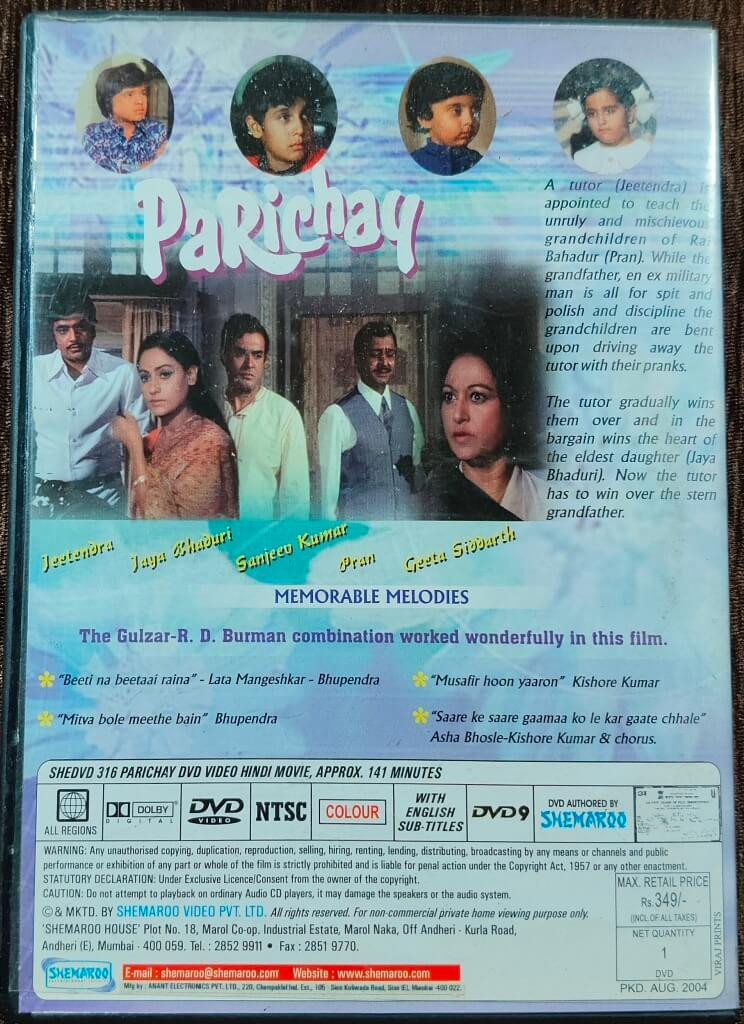 | The Movie | : | Parichay is a heartwarming musical drama directed by Gulzar, featuring stellar performances by Jeetendra, Jaya Bhaduri, and Sanjeev Kumar. The story revolves around a young tutor who is assigned to discipline a group of mischievous children raised under a strict and emotionally distant grandfather. Through patience, compassion, and music, he gradually transforms their lives while also finding love and acceptance. |