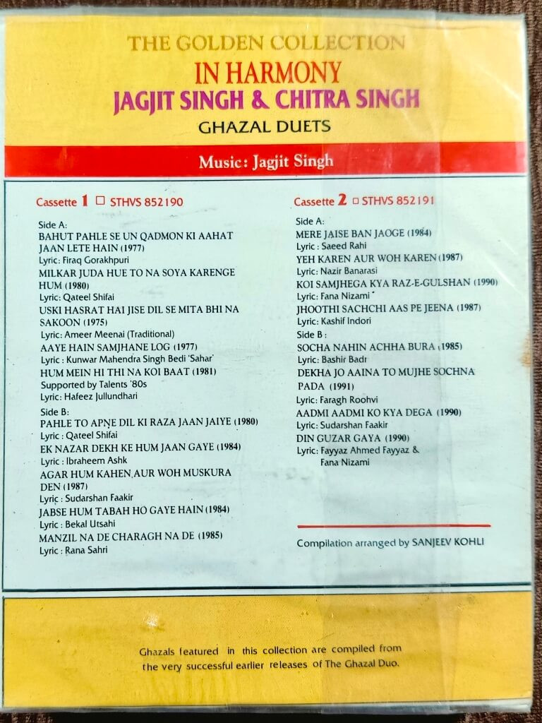| Album Summary | : | A pristine, seal-packed HMV double-cassette compilation showcasing the timeless ghazal duets of Jagjit Singh and Chitra Singh. In Harmony curates some of their most emotionally resonant recordings, drawn from earlier landmark releases, and highlights the golden era of modern ghazal music. |