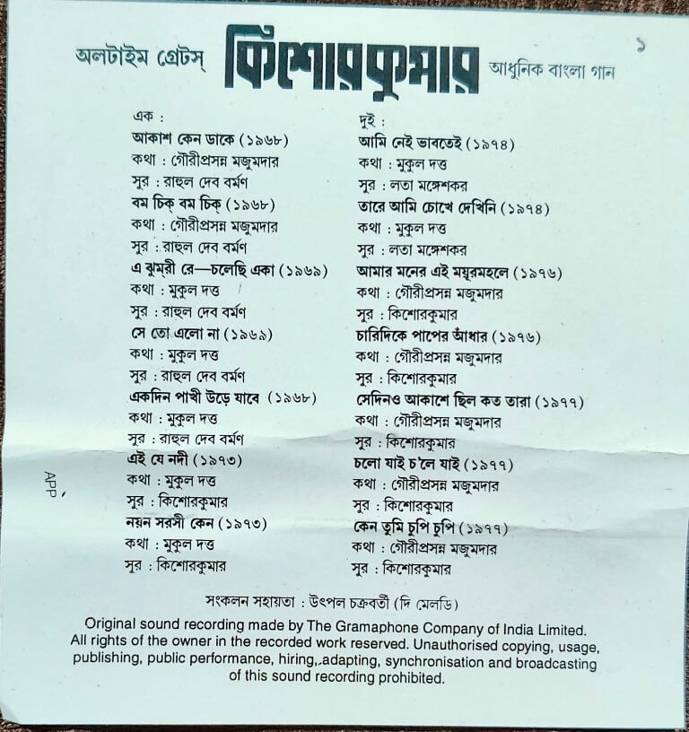 | A6. Ei Je Nodi (1973) | : | Lyrics: Mukul Dutta Music: Kishore Kumar |