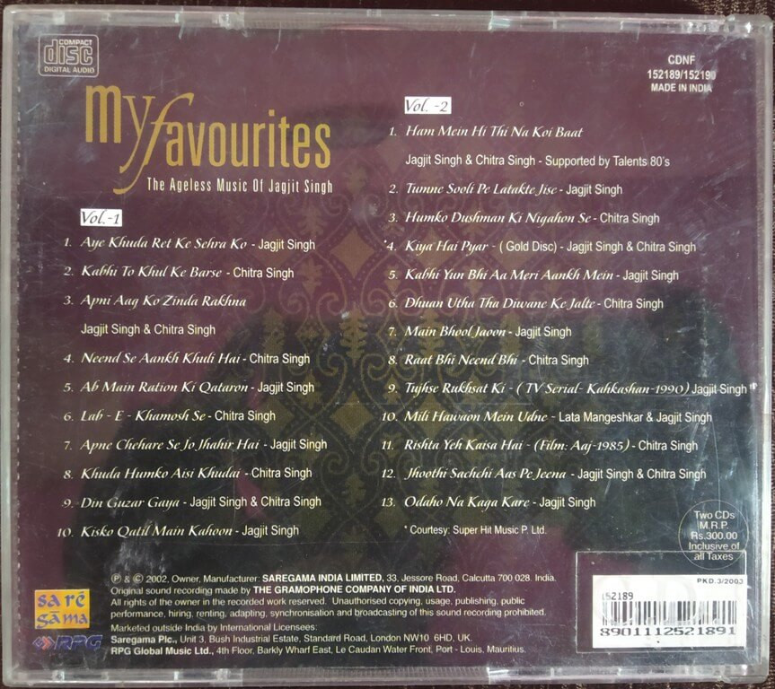 | Title | : | Jagjit & Chitra Singh – My Favourites The Ageless Music Of Jagjit Singh Vol. 1 & 2 Double CD |