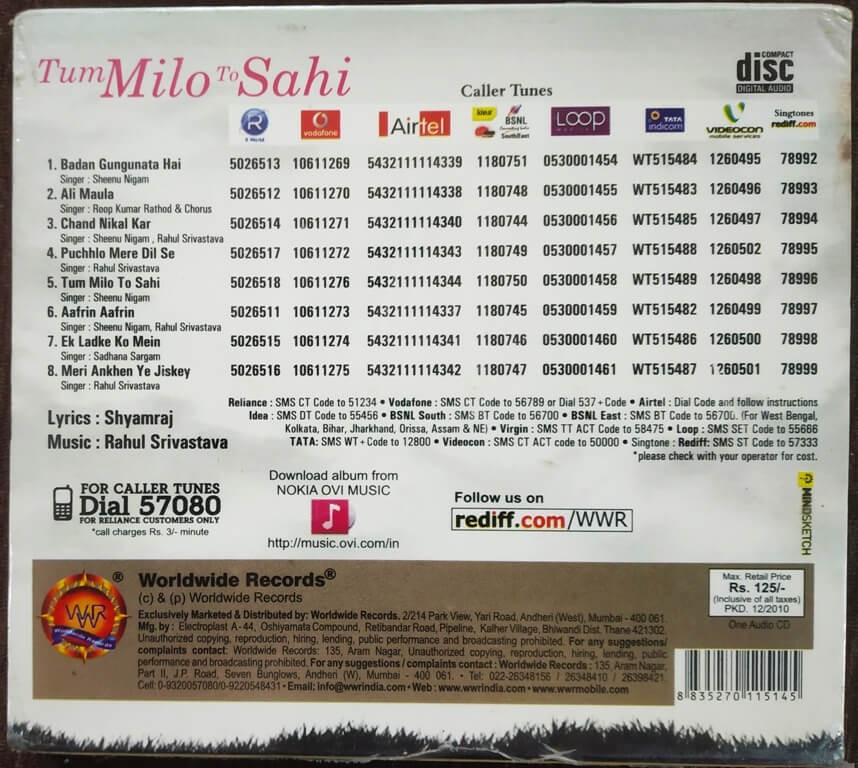 | 5. Tum Milo To Sahi | : | Sheenu Nigam |