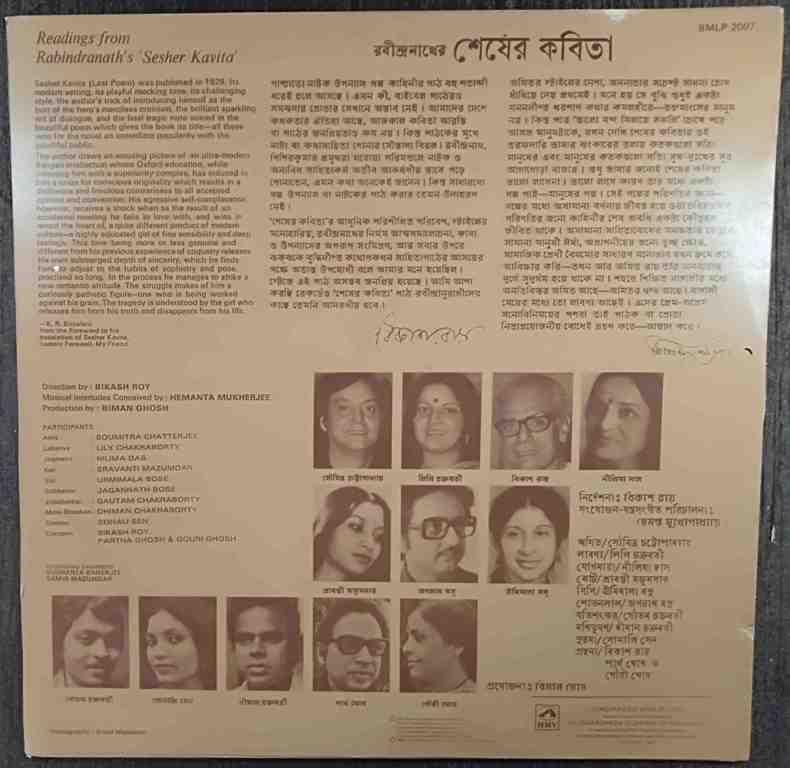 | Sesher Kavita (Last Poom) was published in 1929. Its modern setting, its playful mocking tone, its challenging style, the author's trick of introducing himself as the butt of the hero's merciless criticism, the brilliant sparkling wit of dialogue, and the final tragic note voiced in the beautiful poem which gives the book its title-all these won for the novel an immediate popularity with the youthful public. | ||