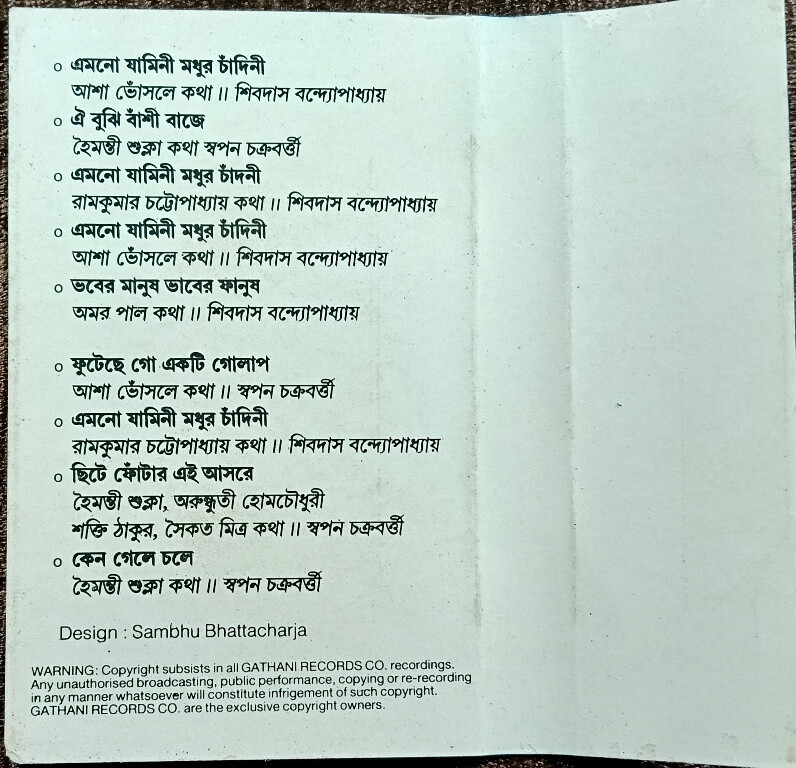 | A1. Emono Jamini Modhur Chandini | : | Asha Bhosle (Kotha: Shibdas Bandyopadhyay) |