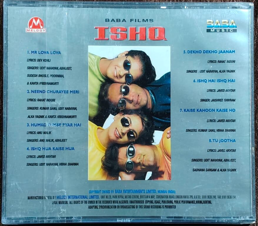 | Packaging | : | Pre-Owned, Brand-new sealed imported Baba Music / Melody Double Audio CD set, including original jewel cases and printed inlays. A premium collectible item, perfect for fans of Ishq, Anu Malik’s music, and classic 1990s Bollywood soundtracks. |