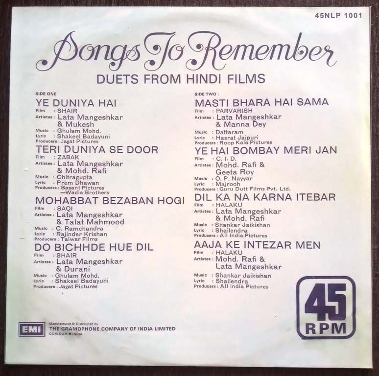 | Title | : | Songs To Remember (Duets From Hindi Films) |