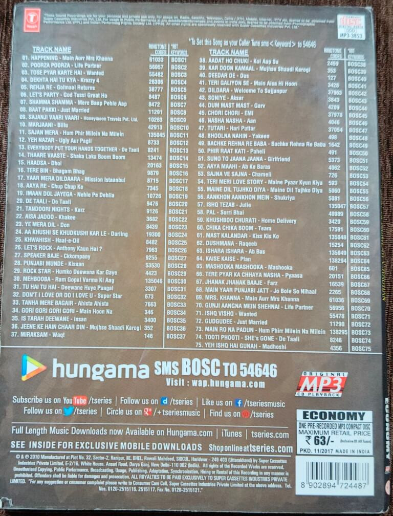 | About the Packaging | : | The packaging reflects T-Series’ economy series design—simple yet functional—offering maximum content within a minimal physical format, making it a practical choice for everyday listening and archival purposes. |