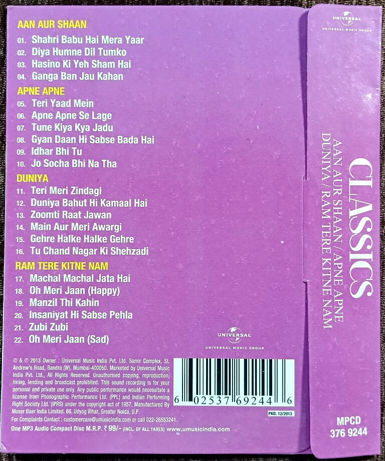 | Album Summary | A rare Universal Music MP3 compilation featuring four complete R. D. Burman soundtracks, all remastered in MP3 quality on a single disc. Includes iconic tracks from Aan Aur Shaan, Apne Apne, Duniya, and Ram Tere Kitne Nam. | |