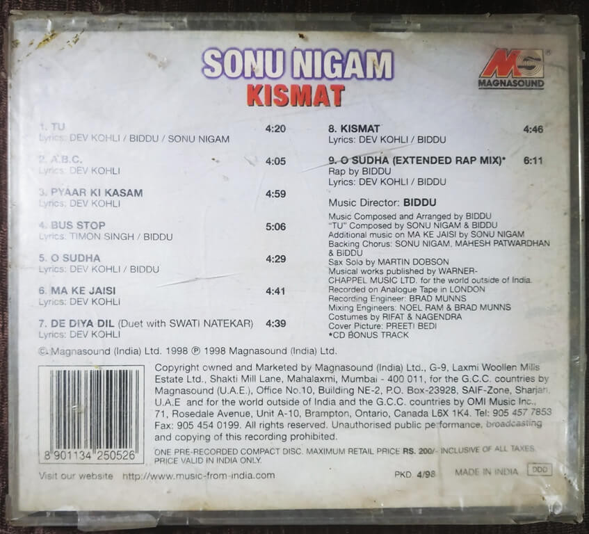 | 9. O Sudha (Extended Rap Mix) | : | Biddu, Sonu Nigam |