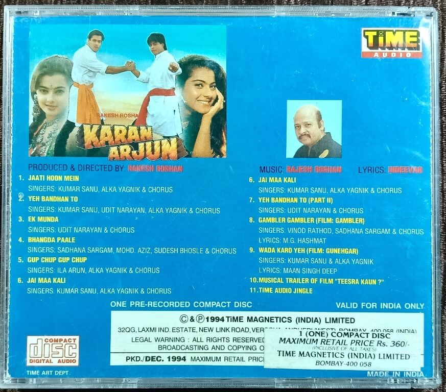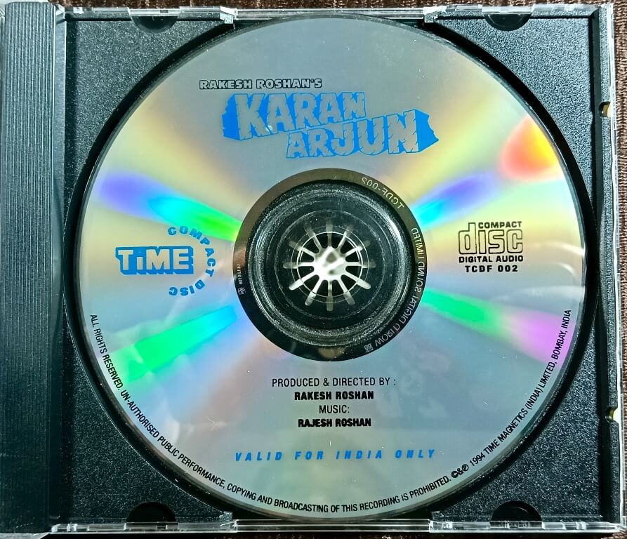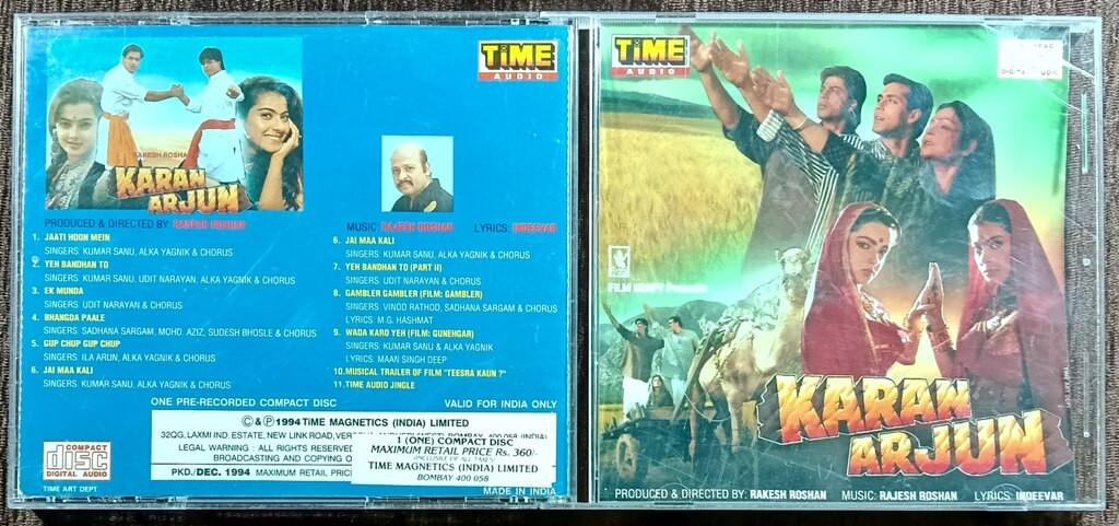 | Album Summary | : | A highly collectible and rare Time Audio first-edition soundtrack of Karan Arjun, featuring the hit musical collaboration of Rajesh Roshan and Indeevar. Includes chartbusters such as Jaati Hoon Mein, Yeh Bandhan To, Bhangda Paale, and Gup Chup Gup Chup. This edition also contains bonus tracks from other Time Audio releases, enhancing its archival and collector value. |