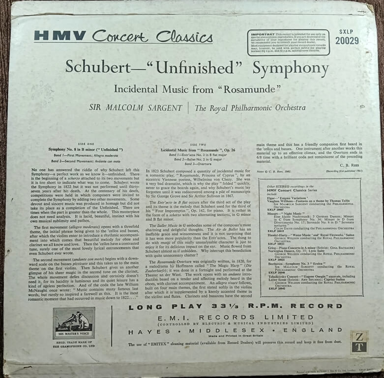 | Title | : | Schubert, Sir Malcolm Sargent Conducting Royal Philharmonic Orchestra – Unfinished Symphony/Incidental Music To Rosamunde |
