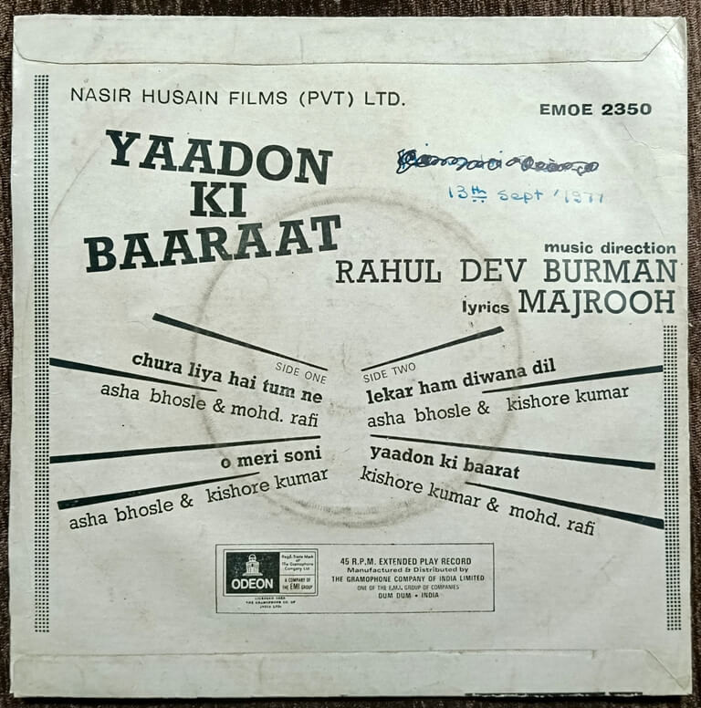 | B2. Yaadon Ki Baarat | : | Lata Mangeshkar, Padmini, Shivangi & Chorus |