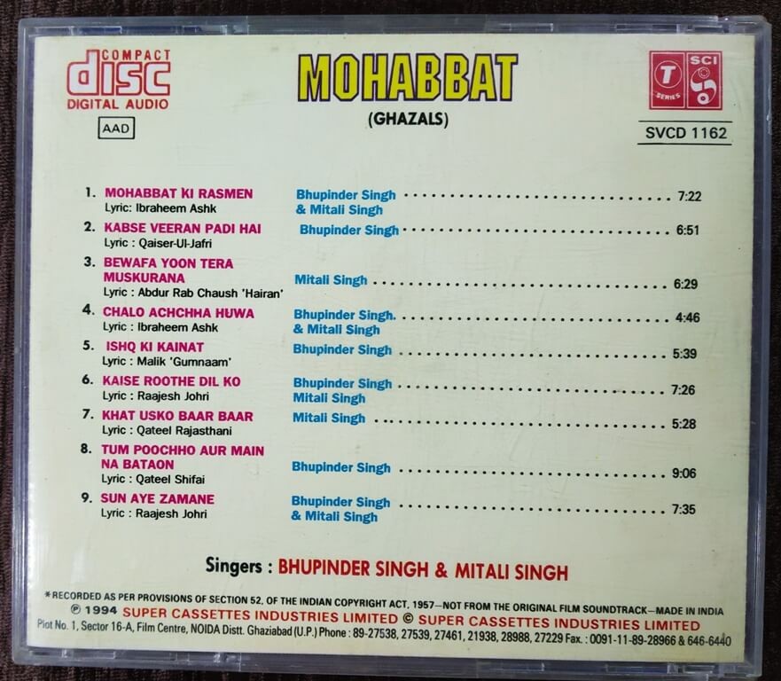 | Title | : | Bhupinder Singh & Mitali Singh - Mohabbat |