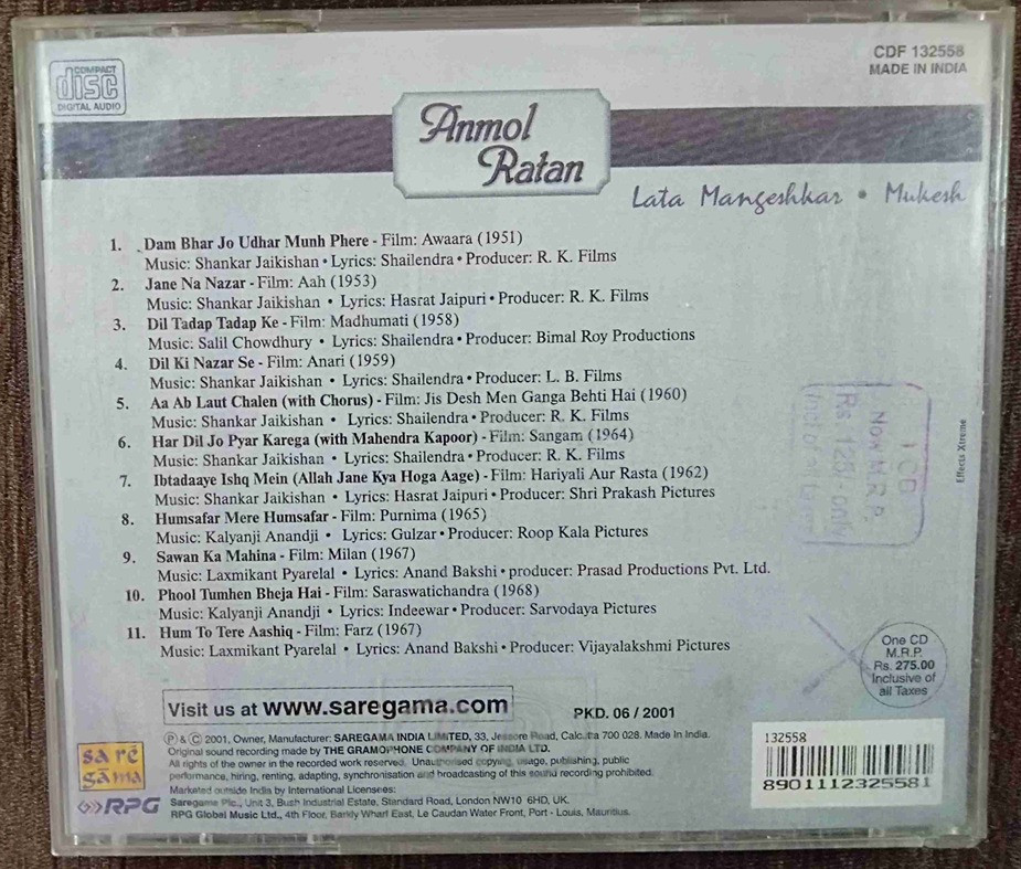 | 1. Dam Bhar Jo Udhar Munh Phere (Awaara 1951) | : | Lata Mangeshkar & Mukesh |