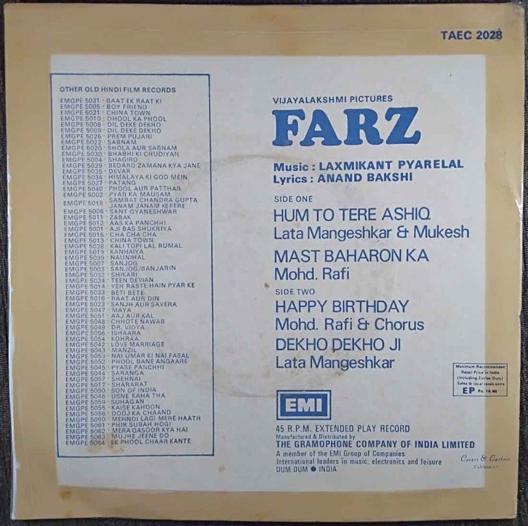 | 1. Hum To Tere Aashiq | : | Mukesh & Lata Mangeshkar |