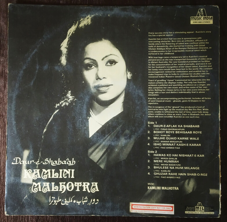 | Lyrics | : | Firaq Gorakhpuri, Kamlini, Anwar Mirzapuri, Faiz Ahmed Faiz, Mirza Ghalib & Mehdi Badayuni |