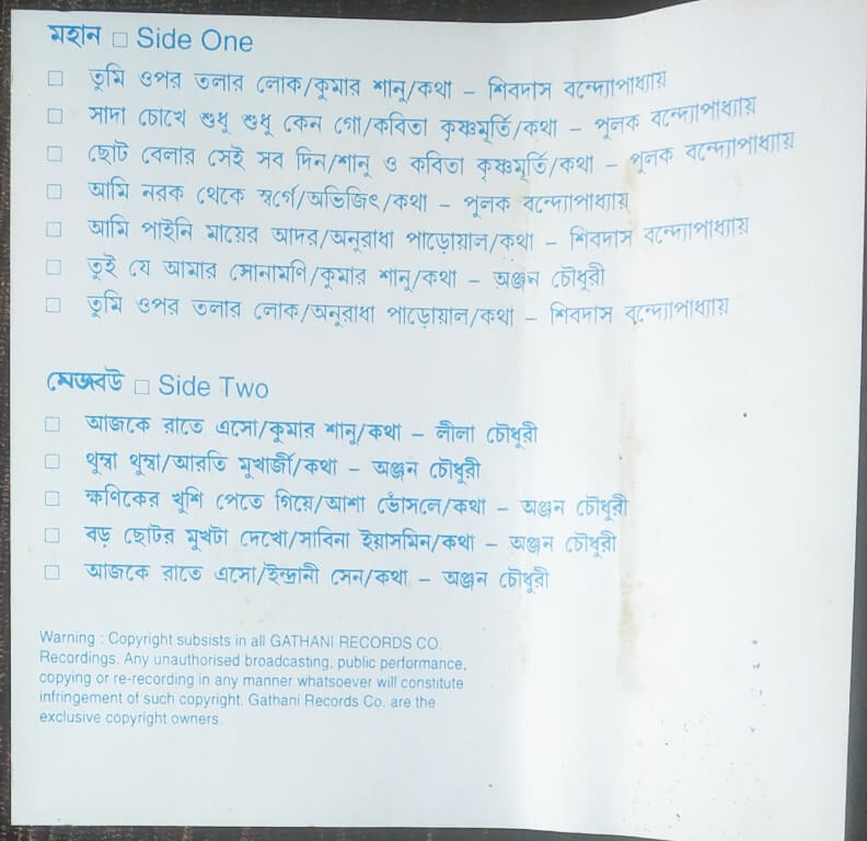 | A2. Shada Chokhe Shudhu Shudhu Keno Go | : | Kabita Krishnamurthy |