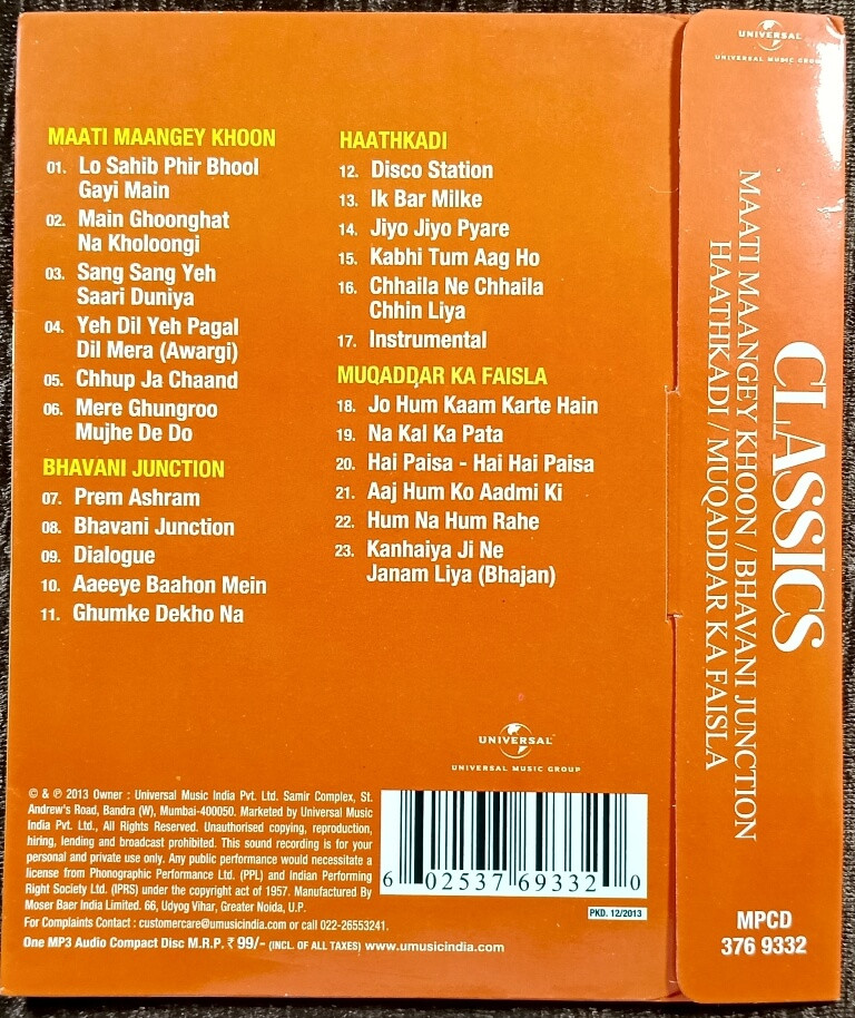 | Album Summary | : | A Universal Music India MP3 compilation featuring four complete Bollywood soundtracks from the early 80s to mid-80s. This rare set includes the powerful melodies of R. D. Burman (Maati Maange Khoon) and the energetic compositions of Bappi Lahiri (Bhavani Junction, Haathkadi, and Muqaddar Ka Faisla). |