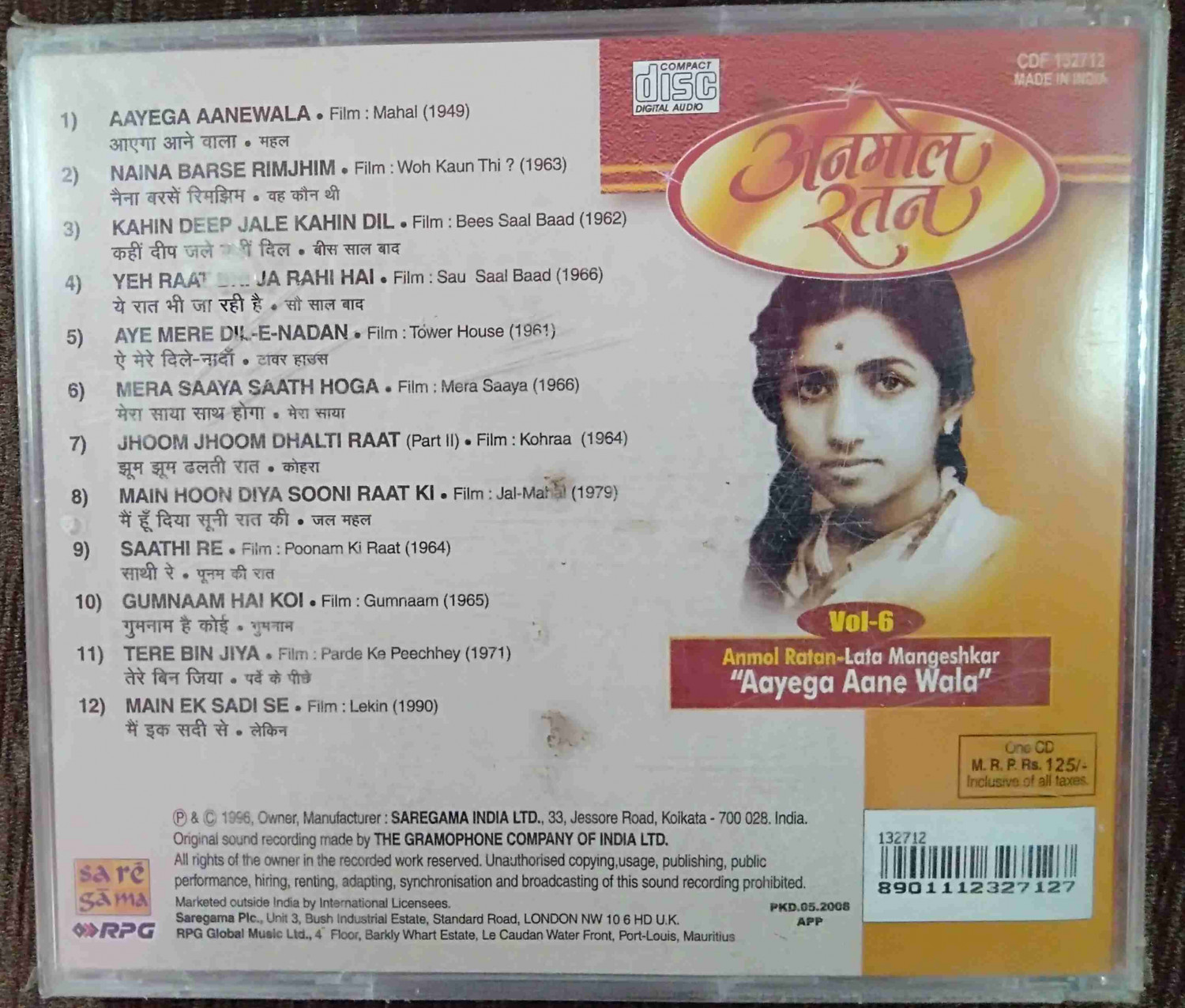 | Title | : | Lata Mangeshkar - Aayega Aane Wala - Anmol Ratan - Vol 6 |