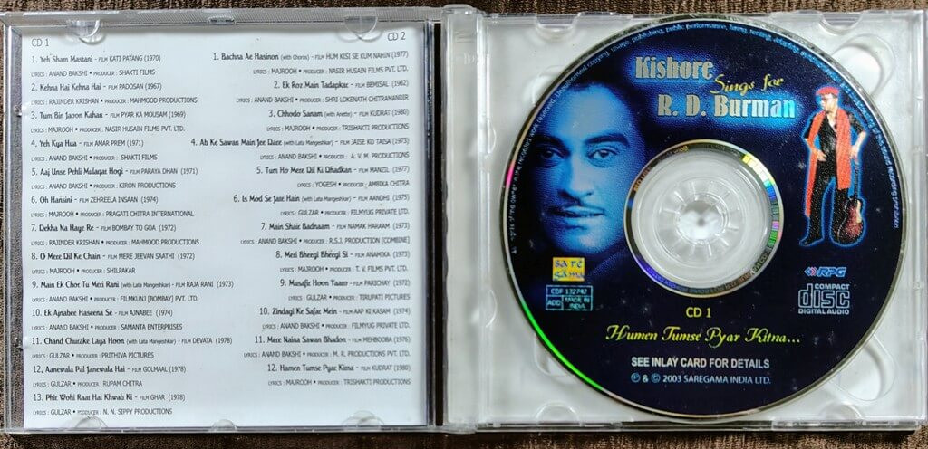 | Album Summary | : | A definitive tribute to the legendary partnership of Kishore Kumar and R. D. Burman, this double-CD compilation brings together timeless classics spanning romance, introspection, and melodic brilliance. From evergreen chartbusters like Yeh Shaam Mastani and O Mere Dil Ke Chain to the iconic title track Humen Tumse Pyar Kitna, the album is a must-have for classic Bollywood music collectors. |